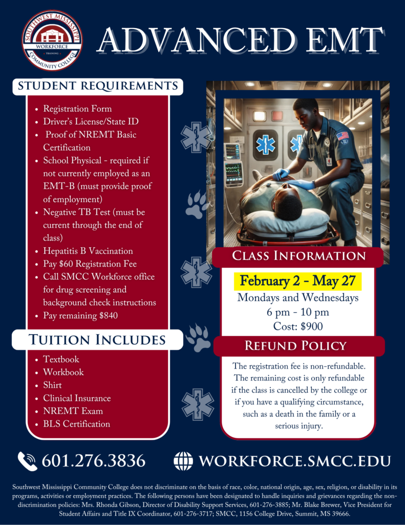 Southwest Mississippi Community College does not discriminate on the basis of race, color, national origin, age, sex, religion, or disability in its programs, activities or employment practices. The following persons have been designated to handle inquiries and grievances regarding the non-discrimination policies: Mrs. Rhonda Gibson, Director of Disability Support Services, 601.276.3885; Mr. Blake Brewer, Vice President for Student Affairs and Title IX Coordinator, 601.276.3717; SMCC, 1156 College Drive, Summit, MS 39666.