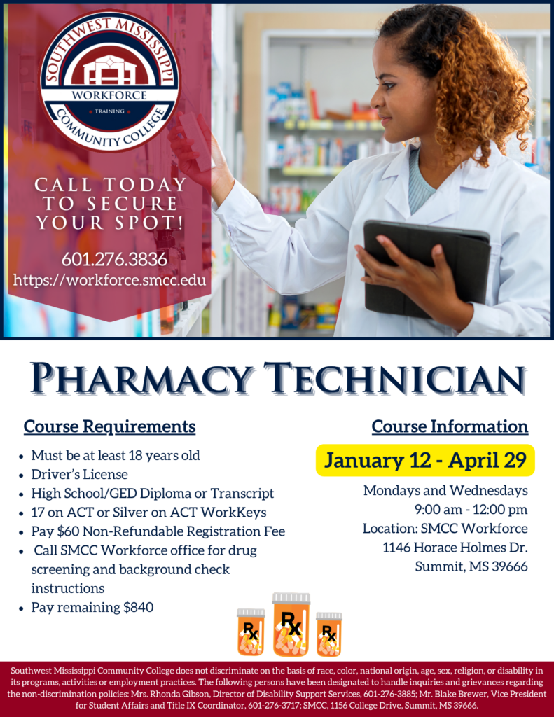 Southwest Mississippi Community College does not discriminate on the basis of race, color, national origin, age, sex, religion, or disability in its programs, activities or employment practices. The following persons have been designated to handle inquiries and grievances regarding the non-discrimination policies: Mrs. Rhonda Gibson, Director of Disability Support Services, 601.276.3885; Mr. Blake Brewer, Vice President for Student Affairs and Title IX Coordinator, 601.276.3717; SMCC, 1156 College Drive, Summit, MS 39666.