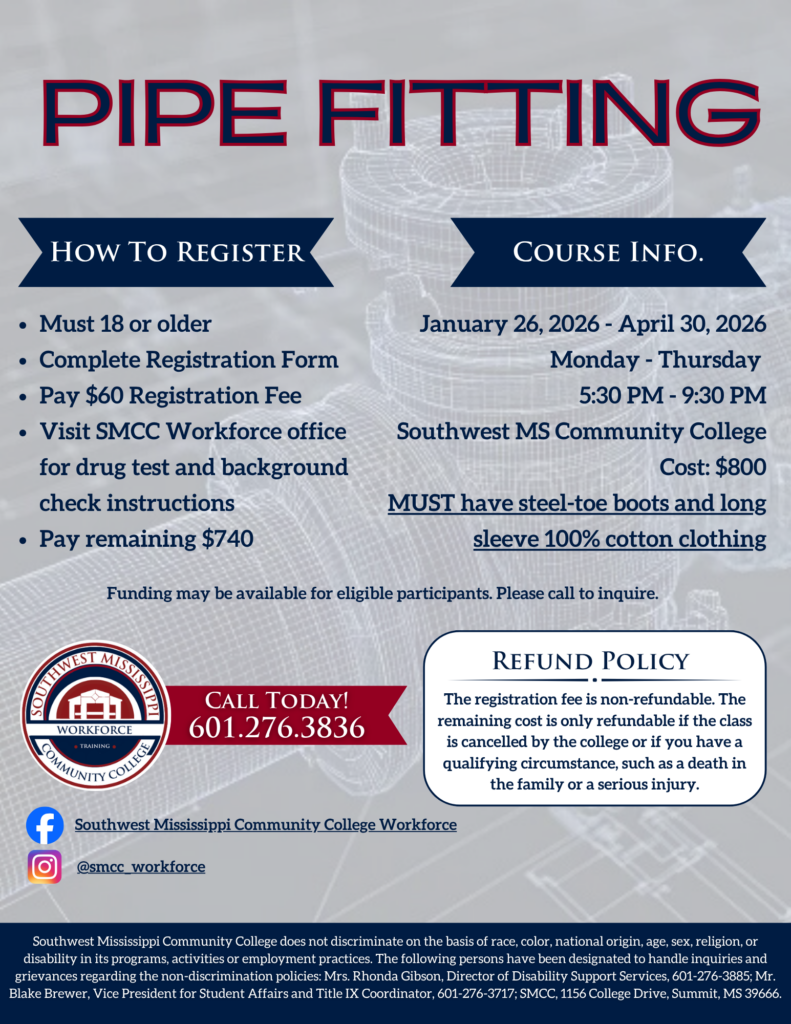 Entry-level Pipefitter positions are currently in high demand in the Mississippi and Louisiana area with average starting wage of $25 per hour. Your skills translate to a jobs as a: Construction Pipefitter, Maintenance Pipefitter, Industrial Pipefitter, Residential Pipefitter, and Commercial Pipefitter. Students will earn a NCCER Core and NCCER Pipefitting Level 1 Certification at the successful completion of the training.